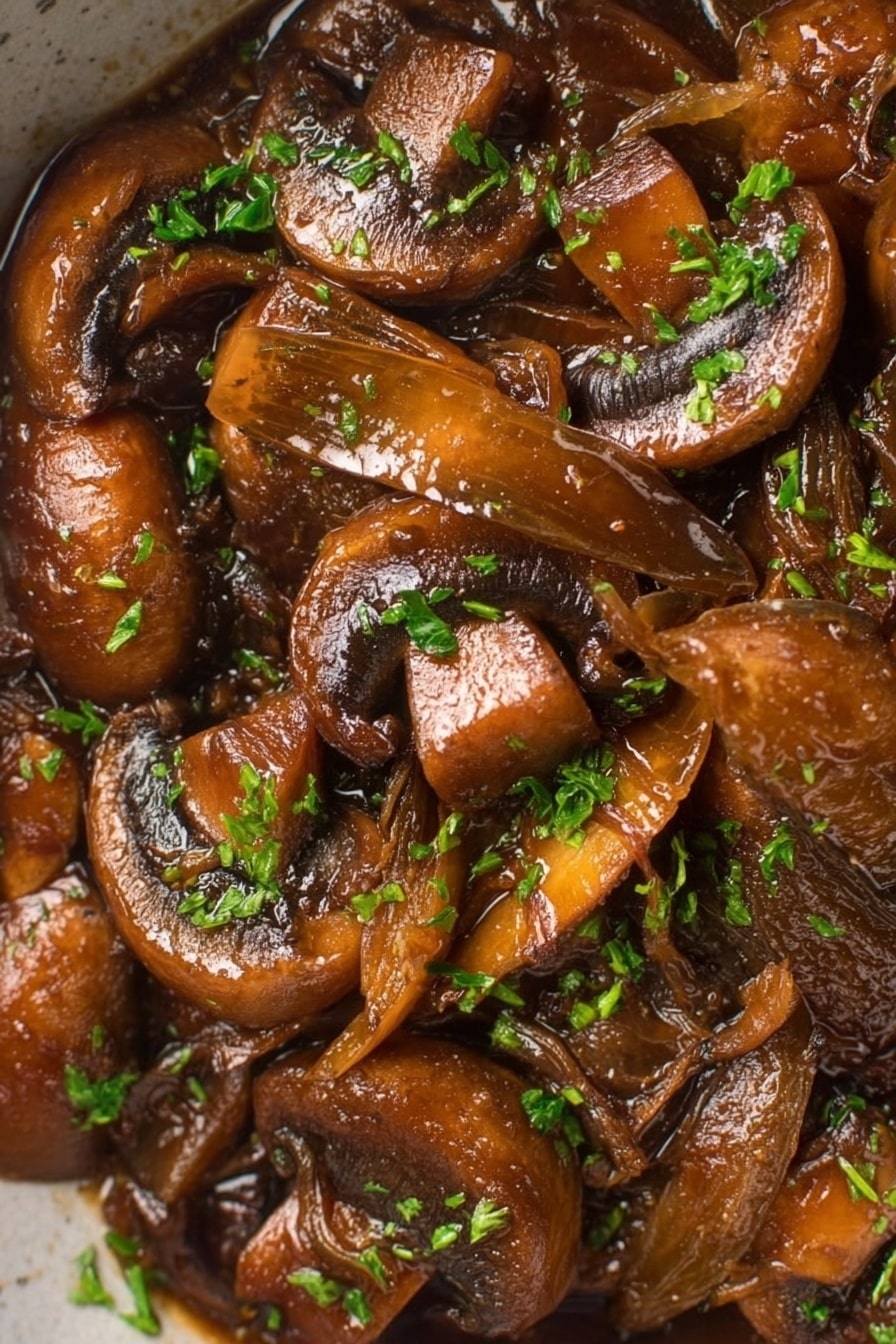 The image shows a close-up of many cooked dark brown mushrooms layered closely, with a shiny and slightly wet texture. The mushrooms are coated in a rich, dark brown sauce that gives them a glossy look. Small bits of green parsley are sprinkled on top, adding specks of color to the mostly brown dish. The mushrooms vary in shape and size, with soft, curved edges and a tender appearance. The background is a white marbled surface. photo taken with an iphone --ar 2:3 --v 7 - Slow Cooker Brisket with BBQ Sauce, brisket recipe, easy slow cooker beef, smoky BBQ beef, tender brisket recipe