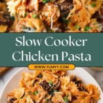 A white plate filled with a mix of bowtie pasta, shredded cooked chicken, sautéed dark brown mushrooms, and wilted green spinach. The pasta and chicken are coated in a light reddish-orange sauce with small bits of green herbs sprinkled across the top, along with a few grated white cheese flakes. The plate sits on a white marbled surface with a clear glass jar of uncooked bowtie pasta and a small grater with cheese shavings next to it. A blue and white striped cloth is draped nearby, and two metal forks are placed at the bottom left corner of the image. Photo taken with an iphone --ar 2:3 --v 7 - Slow Cooker Chicken Bacon Pasta, easy slow cooker pasta recipes, creamy chicken bacon pasta, comfort food dinner ideas, simple slow cooker recipes