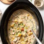 This Slow Cooker Chicken Pot Pie Soup is a comforting, creamy dish packed with tender chicken, hearty potatoes, mixed vegetables, and a rich, flavorful sauce. Easy to prepare and perfect for a cozy meal, it’s served with warm homemade biscuits and can be customized with fresh herbs for garnish.