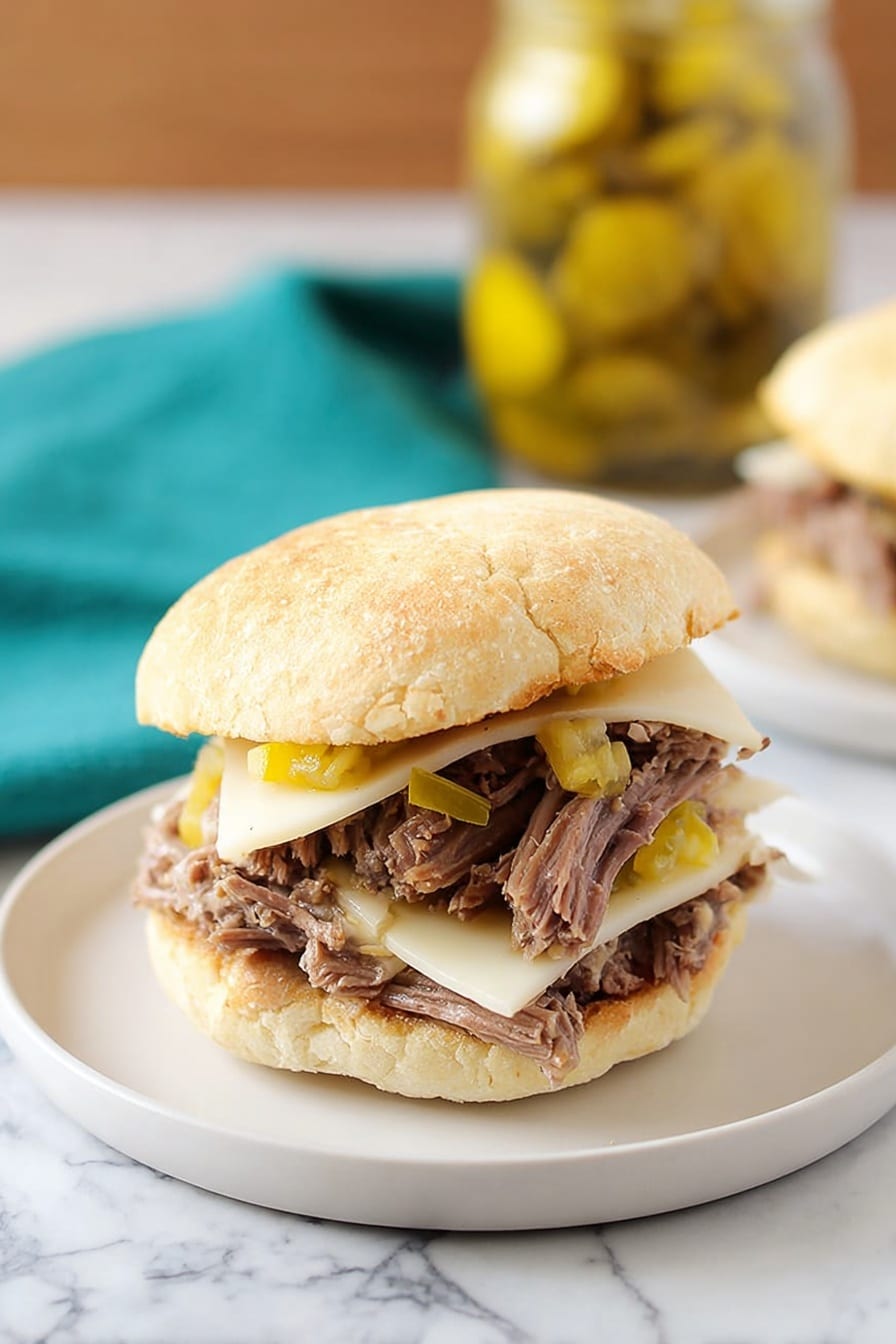 This part’s optional but trust me, toasting your rolls with a little butter makes a big difference. I usually toast them lightly in a pan or under a broiler until golden. Then, pile on a generous helping of the shredded beef, add a slice of your preferred cheese, and some extra sliced peppers if you want that extra tang.