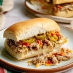 - Assemble the sandwiches: Preheat the oven to 375°F (190°C). Split the hoagie buns and place them cut side up on a baking sheet. Toast in the oven for 5 minutes until slightly golden on the edges. Place a slice of provolone cheese on the bottom half of each bun so it melts with the heat and hot chicken. Fill with the shredded chicken mixture, then top with extra pepperoncini slices and chopped giardiniera as desired. Serve immediately and enjoy!