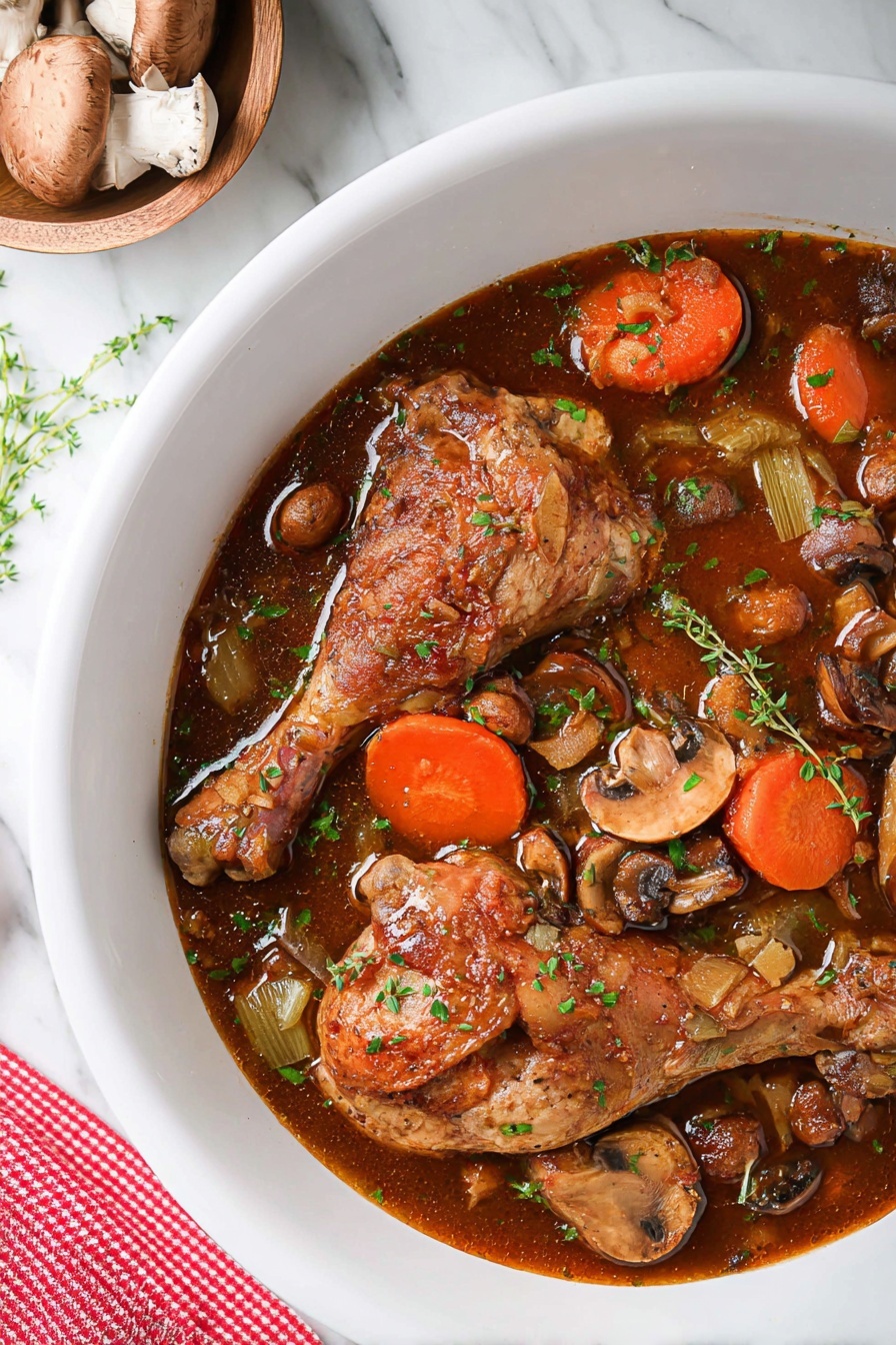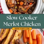 This Slow Cooker Merlot Chicken recipe features tender chicken drumsticks simmered in a savory sauce of Merlot wine, tomato sauce, and aromatic vegetables and herbs. The dish is layered with crispy bacon, mushrooms, carrots, celery, and onion, slow-cooked to perfection for a comforting and flavorful meal perfect for an easy weeknight dinner.