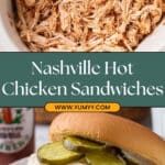 4. Assemble Sandwiches: Serve the shredded Nashville hot chicken on toasted hamburger buns. Top with ranch dressing, pickle slices, and optional diced onions for added crunch and flavor. Optionally, use biscuits or Hawaiian rolls and add coleslaw for variation.