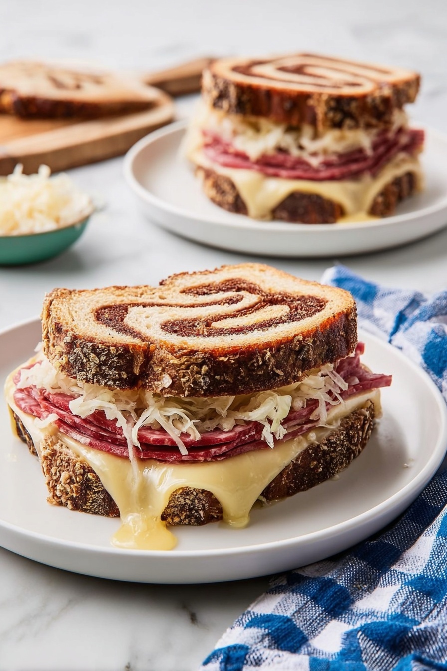 When I serve this recipe, I love piling on classic Reuben toppings: tart sauerkraut, melty Swiss cheese, and tangy Thousand Island dressing. It’s that perfect balance of creamy, sour, and savory that everybody in my family raves about. Toast your marble rye bread for added crunch and warmth—it’s the perfect vehicle for all those flavors.