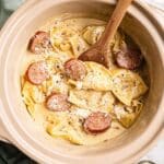 A comforting and easy slow cooker pierogies recipe featuring classic cheddar pierogies, kielbasa, and creamy cheeses simmered in chicken broth, perfect for a hassle-free hearty meal.
