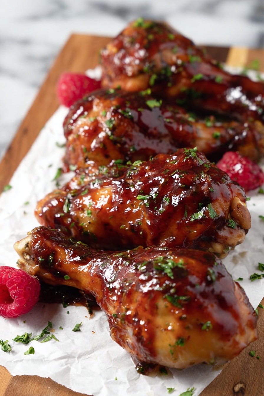 The image shows three cooked chicken drumsticks covered in a sticky, dark reddish-brown sauce with small bits of spices and herbs visible on the surface. They have a shiny texture, and the skin looks slightly crispy. The drumsticks lie on white parchment paper sprinkled with small, chopped green herbs. Around the drumsticks, there are three fresh raspberries adding a bright red color contrast. The scene is set on a white marbled surface. photo taken with an iphone --ar 2:3 --v 7 - Slow Cooker Raspberry Chicken Drumsticks, raspberry chicken recipe, easy slow cooker chicken, flavorful chicken drumsticks, sweet and tangy chicken