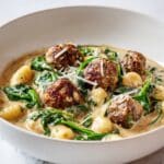 Dish out the tender gnocchi and meatballs into warm bowls, and don’t be shy with extra Parmesan on top. The creamy sauce clinging to the gnocchi, paired with the savory meatballs, makes every bite pure joy.