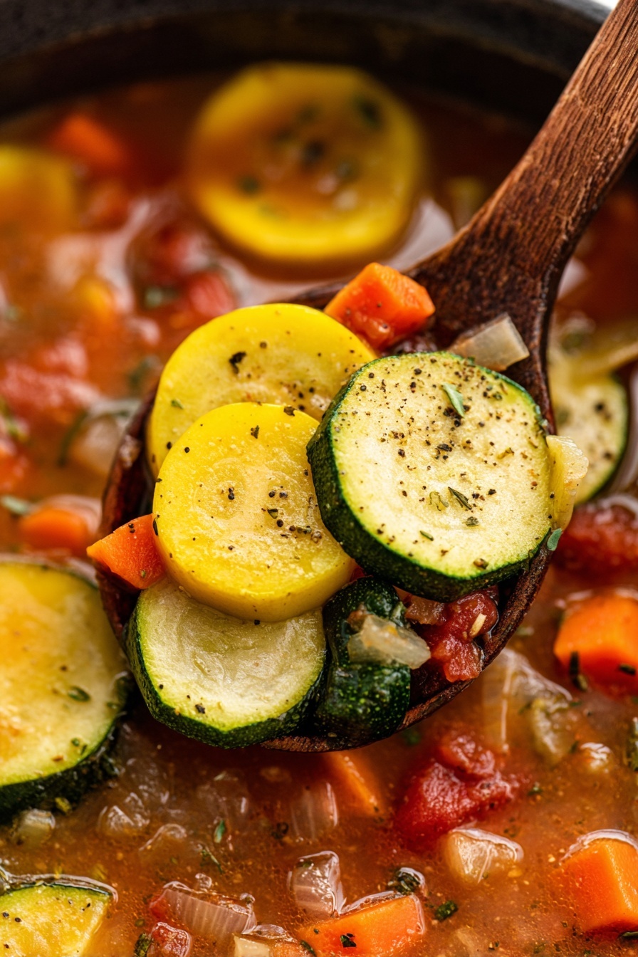• The zucchini and squash are added towards the end to prevent overcooking and maintain texture.
