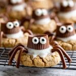- Decorate Spiders: Pour melted chocolate into a small ziplock bag and snip a tiny corner. Pipe a small amount of chocolate into the Reese’s indent on each cookie. While the chocolate is still soft, place one Reese’s cup (with the larger surface facing down) into the chocolate on each cookie. Pipe four “legs” on each side of the peanut butter cup with chocolate. Dab chocolate on the backs of candy eyes and stick them onto the Reese’s cup to create spider eyes.