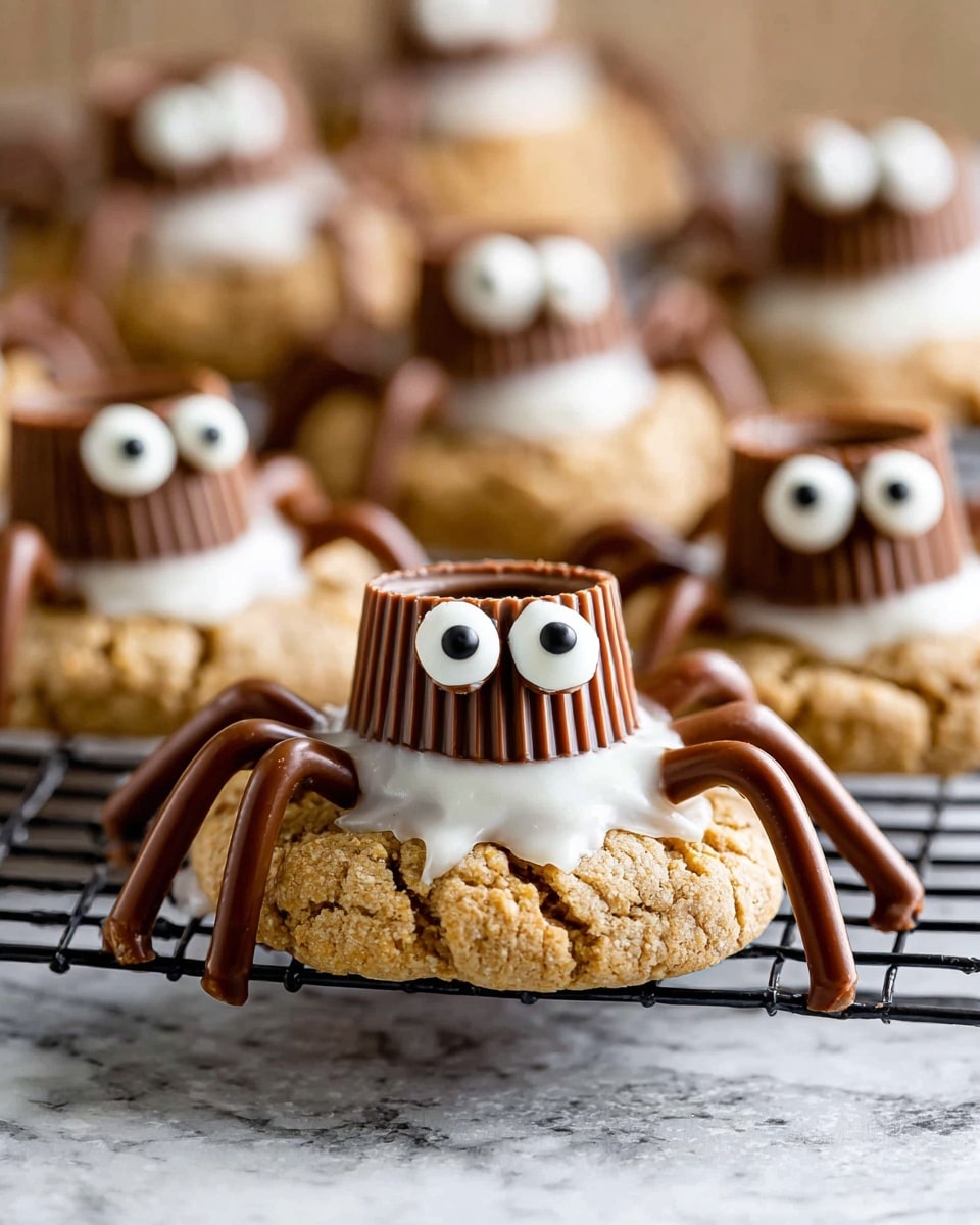 These Spooky Spider Cookies are a perfect Halloween treat combining the rich flavors of peanut butter and dark chocolate with fun, creepy marshmallow cobweb decorations. Soft peanut butter cookies are topped with Reese’s mini peanut butter cups, edible candy eyes, and delicate marshmallow spider webs, making them as delightful to look at as they are to eat.