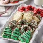 Classic Spritz Cookies made with a buttery, tender dough that is pressed into charming shapes using a cookie press. These buttery cookies have subtle vanilla and almond or peppermint extract flavors, perfect for holiday celebrations or anytime you want a delightful treat. Easily decorated with sprinkles, sanding sugar, or dipped in melted chocolate for a festive touch.