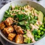 A flavorful and wholesome Sticky Glazed Tofu Bowl featuring crispy tofu cubes coated in a sweet and spicy glaze, served over warm sushi rice with fresh edamame, cucumber, avocado, and drizzled with a creamy, tangy Yum Yum sauce. This easy-to-make vegan dish balances textures and flavors and makes for a perfect meal prep option.