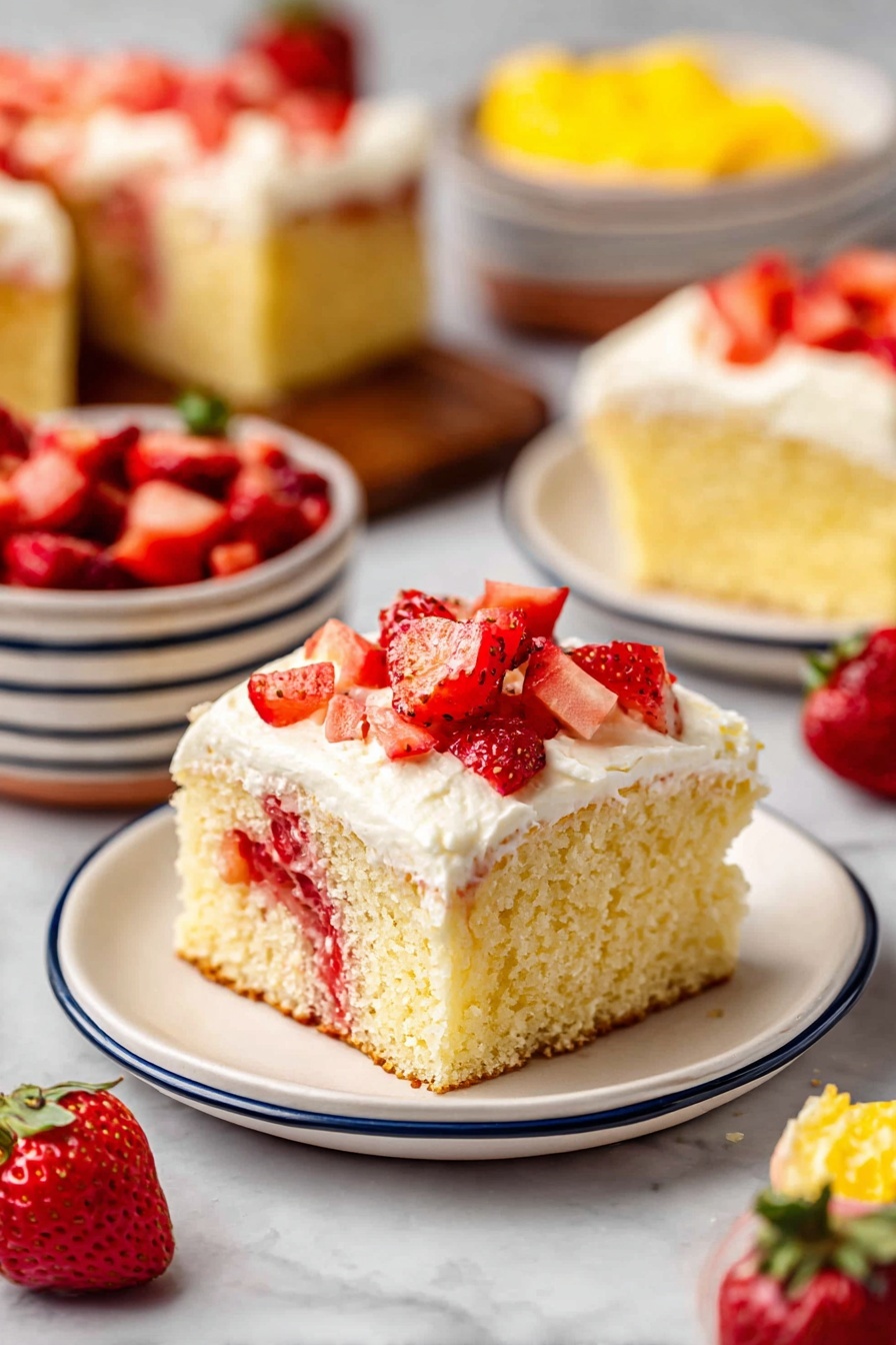 For a summer party, I’ve arranged this cake into individual mini jars—poke cake layers spooned in with fresh strawberry slices and topped with dollops of whipped cream. It’s so cute and lets guests grab-and-go. I’ve also experimented with making it in cupcake liners for bite-sized single servings, which are always a hit with kids.