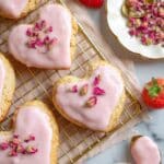 - Glaze Scones: Spoon or pipe the strawberry glaze over cooled scones and garnish with edible dried rose petals. Serve the same day for best freshness.