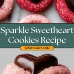 Sparkle Sweetheart Cookies are delightful, soft sugar cookies enhanced with cream cheese for extra tenderness. Rolled in colorful sanding sugar and topped with festive chocolate hearts, these cookies are perfect for celebrations or gifting.