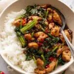 This Thai Chilli Basil Chicken recipe is a quick and vibrant stir-fry featuring tender chicken thigh pieces cooked with aromatic garlic, spicy bird’s eye chili, and fragrant Thai basil leaves. The dish is finished with a glossy, flavorful sauce made from oyster and soy sauces, perfectly balanced by a touch of sugar. Ideal for a speedy weeknight dinner, it pairs wonderfully with steamed jasmine rice for an authentic Thai meal experience.
