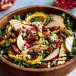 This Thanksgiving Kale Salad with Cranberry Cinnamon Vinaigrette is a vibrant and flavorful dish perfect for holiday gatherings. Featuring roasted delicata squash, crisp kale, baby spinach, apple chips, tangy gorgonzola cheese, toasted pecans, and juicy pomegranate arils, this salad is complemented by a sweet and spicy cranberry cinnamon vinaigrette that ties all the fresh, seasonal flavors together.