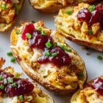 These Thanksgiving Potato Skins are a creative and delicious way to use up holiday leftovers. Crispy roasted russet potato skins are loaded with creamy mashed potatoes, shredded turkey, savory stuffing, and melted sharp cheddar cheese, then topped off with tangy cranberry sauce and fresh chives for a perfect seasonal appetizer or snack.