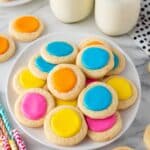 If I’m planning ahead, I freeze the cookie dough balls before baking or the baked cookies without icing. They last up to 2 months frozen. Just remember to thaw dough in the fridge before making indentations to bake, and if you freeze baked cookies, add icing after they’ve fully thawed.