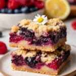 These Triple Berry Crumble Bars combine a buttery shortbread crust with a luscious triple berry filling of raspberries, blueberries, and blackberries, topped with a sweet lemon-zested crumble. Perfectly balanced between tart and sweet, these bars offer a delightful mix of textures with a crisp base and juicy, bubbling fresh berries, making them an irresistible treat for any season or occasion.