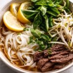 • Prep toppings ahead: I like to prep garnishes like bean sprouts, lime wedges, and herbs while the broth simmers, so everything’s ready to customize the bowl at serving.