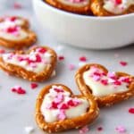 Delightfully simple and festive White Chocolate Pretzel Hearts are the perfect sweet and salty treat for any occasion. Crispy mini pretzels topped with creamy melted white chocolate almond bark and adorned with colorful heart sprinkles create a charming snack that’s quick to prepare and sure to impress.