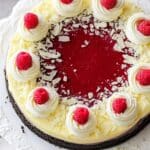 - Decorate Cheesecake: Pipe whipped cream along edges, garnish with fresh raspberries, and optionally grate white chocolate to sprinkle on top.