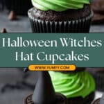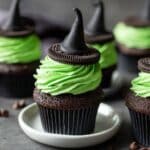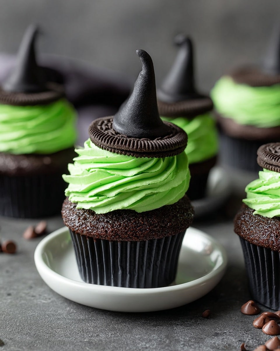These Witches Hat Cupcakes are a festive and delicious Halloween treat featuring rich black chocolate cupcakes topped with fluffy green buttercream frosting and adorned with charming edible witches hat decorations made from Oreo halved bases and fondant cones. Perfect for spooky celebrations!